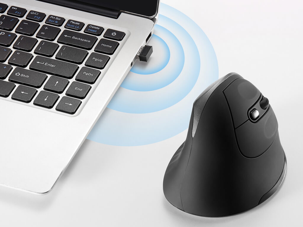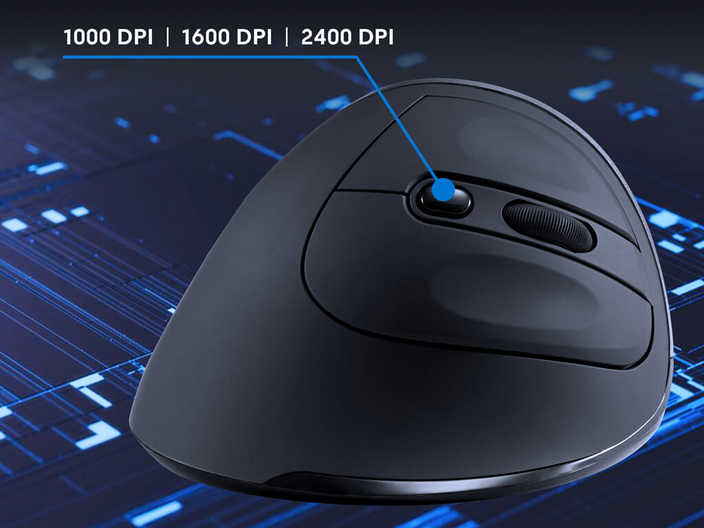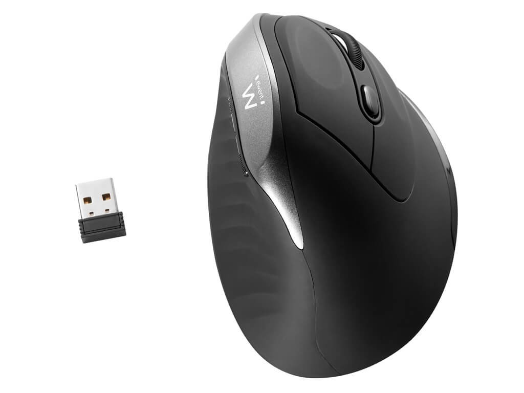 Ergonomska vertikalna miška Ewent s 2400 DPI optičnim senzorjem. Pokončna oblika nudi zapestju bolj naraven položaj in zmanjša obremenitev. Primerna za desničarje. Omogoča brezžično povezavo z USB sprejemnikom. Napajanje s priloženo AA baterijo.
