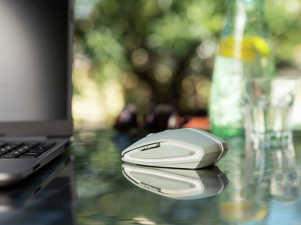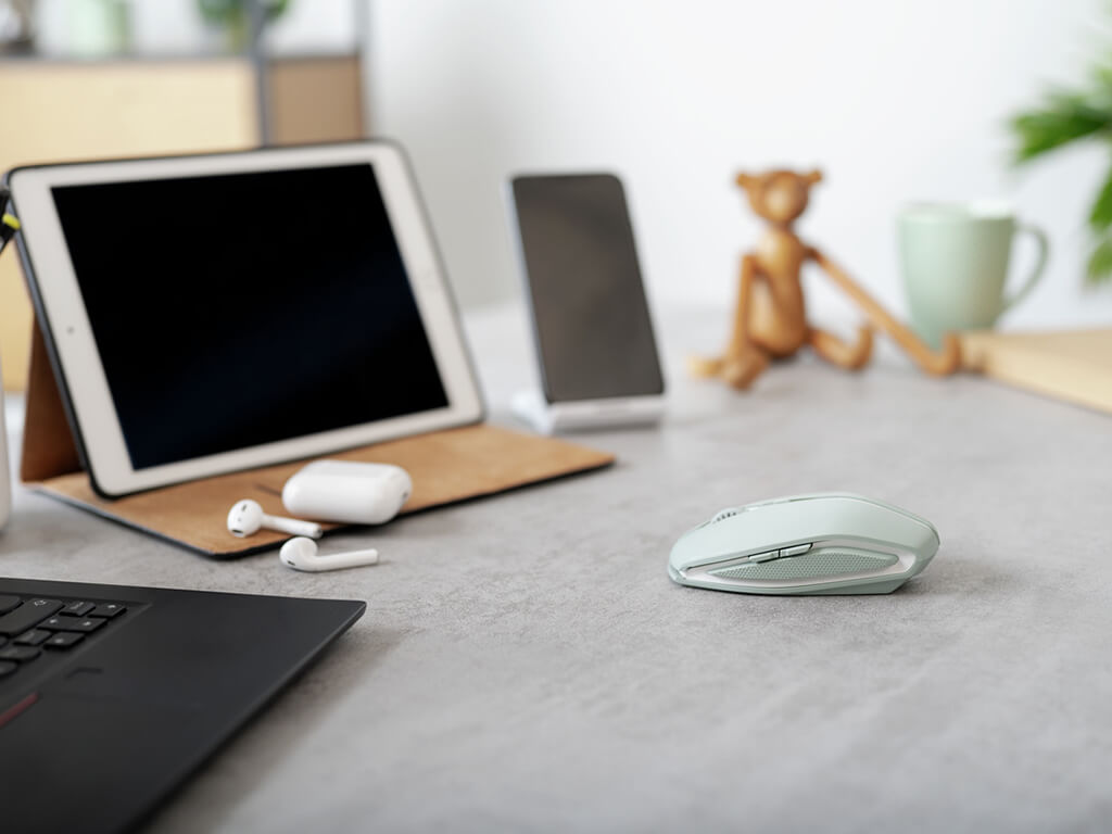 Simetrična miška v trendovski barvi z Bluetooth povezljivostjo in optičnim senzorjem z resolucijo do 2000 DPI. Ima 7 gumbov in kolešček in je primerna za večje in manjše dlani. Omogoča povezavo s tremi napravami. Za delovanje uporablja 2x AAA bateriji.