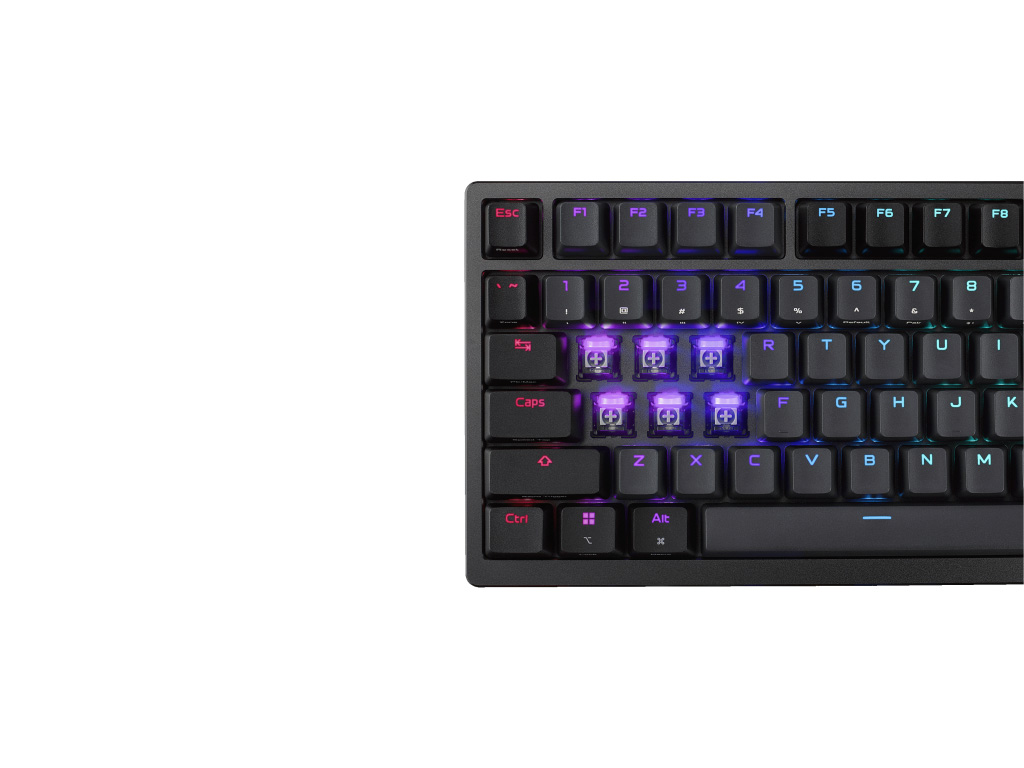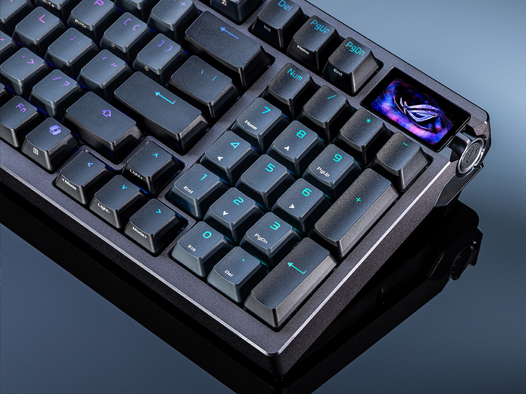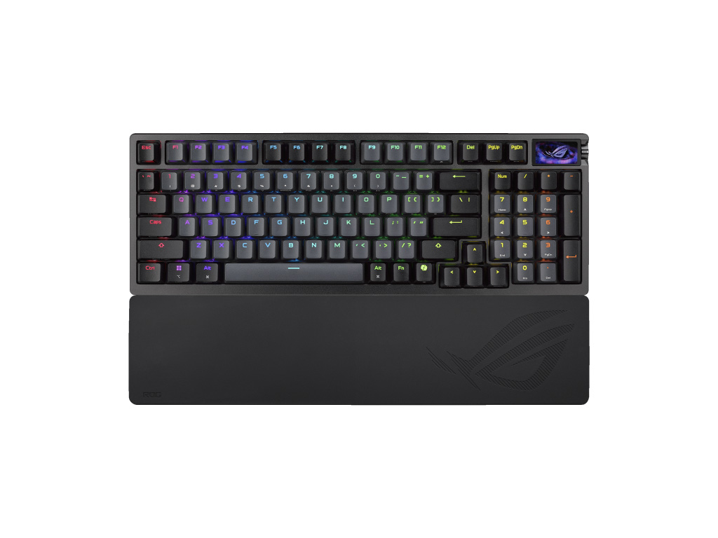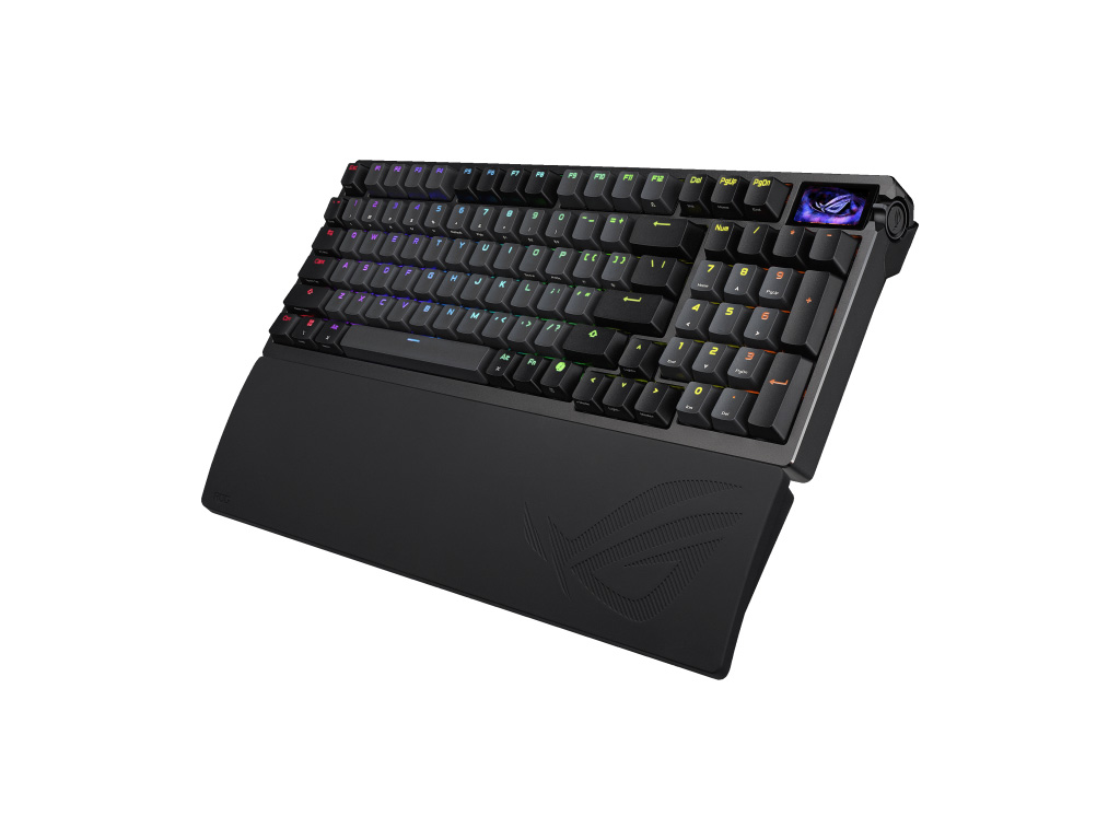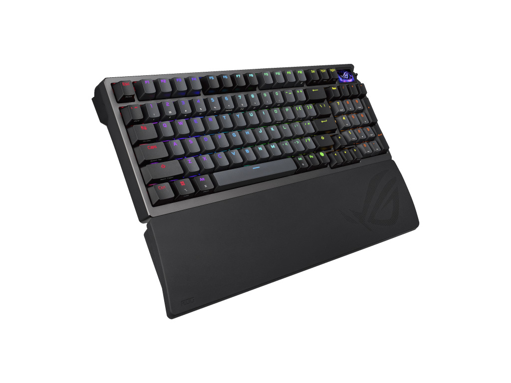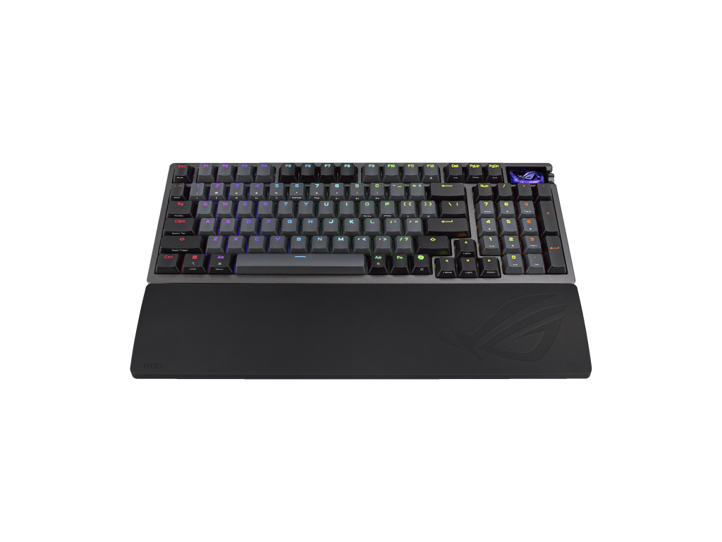 Računalniška opremaTipkovnice za računalnikMehanska 96% igralna tipkovnica z ROG HFX V2 magnetnimi stikali, hall senzorjem, barvnim OLED zaslonom, in povezavo preko ROG SpeedNova 8K brezžične tehnologije z USB sprejemnikom. Individualno RGB osveltjene PBT tipke z šestimi plastmi akustične optimizacije in snemljivim naslonom za zapestje. Omgoča tudi priklop na kabel ali preko bluetootha. Priložene dodatne transparentne tipke.
