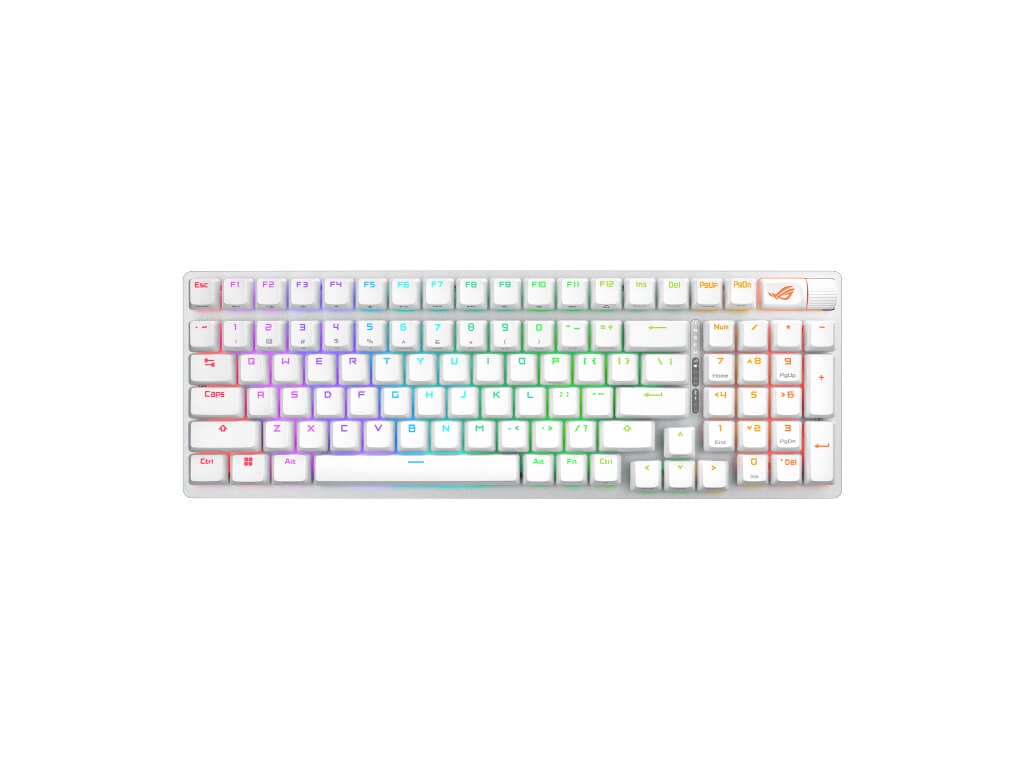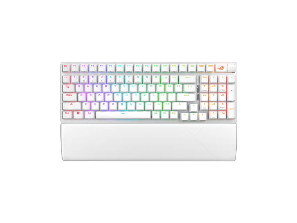 Računalniška opremaTipkovnice za računalnikKompaktna 96% igralna tipkovnica z vsemi funkcijskimi tipkami in številčnico, ki zavzame samo 1cm več prostora na mizi kot običajna 80% igralna tipkovnica. Ima dvoslojne PBT tipke, multimedijske tipke, zamenljiva ROG NX Snow stikala, naslon za zapestja in RGB individualno osvetljene tipke. Omogoča povezavo z Bluetooth, USB kablom in z USB Omni 2,4GHz sprejemnikom. Priložen USB-A v USB-C kabel dolžine 2m.