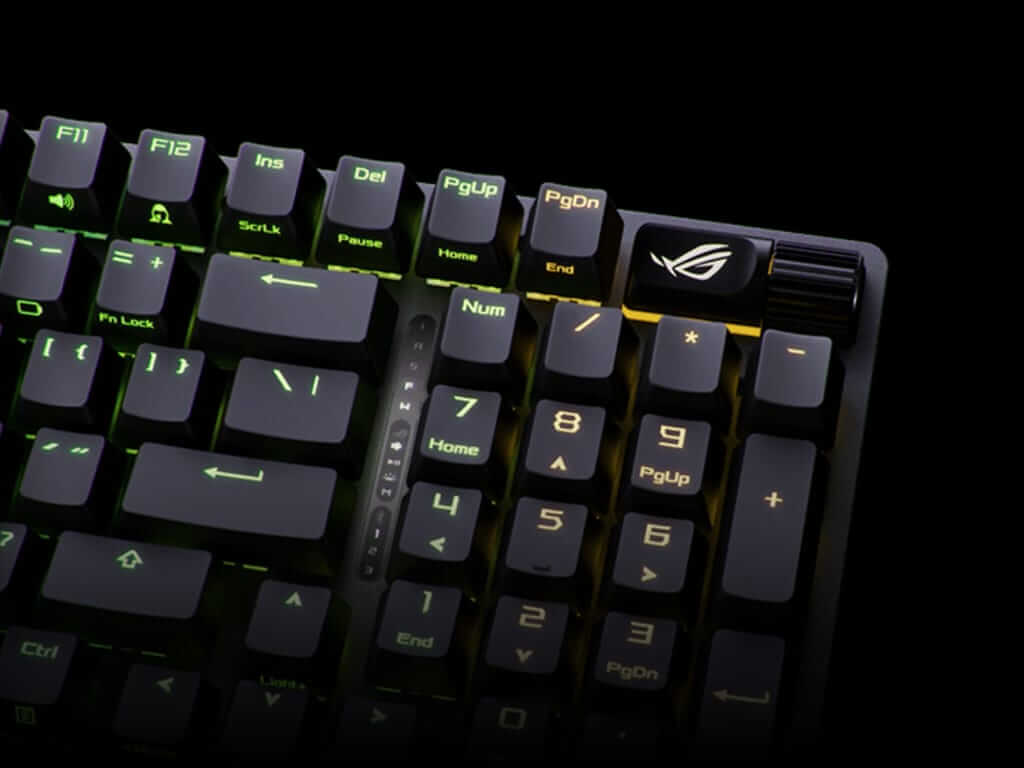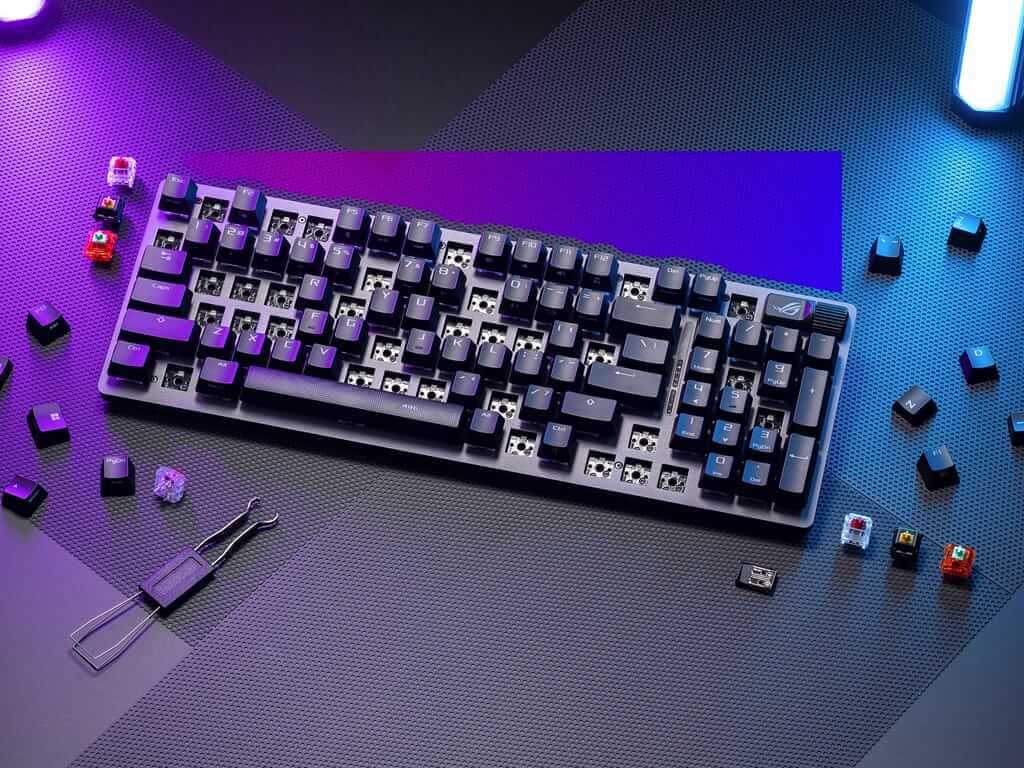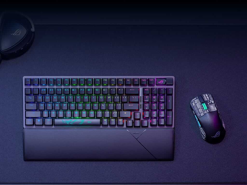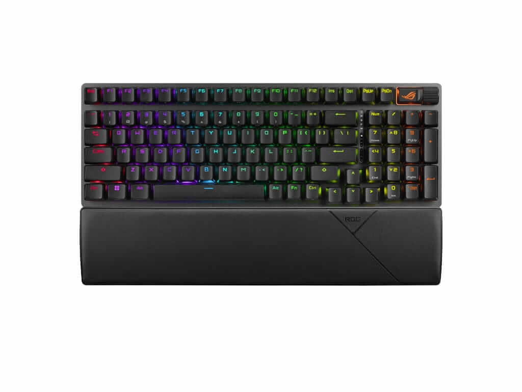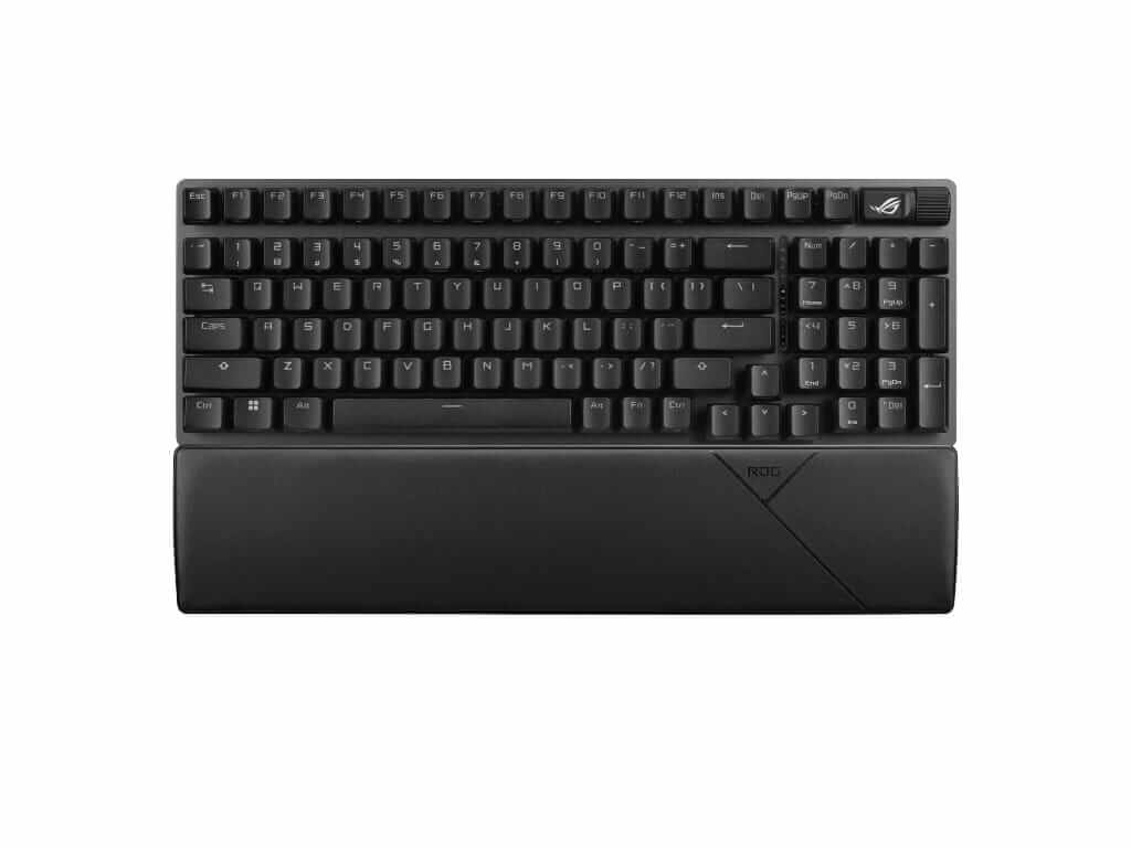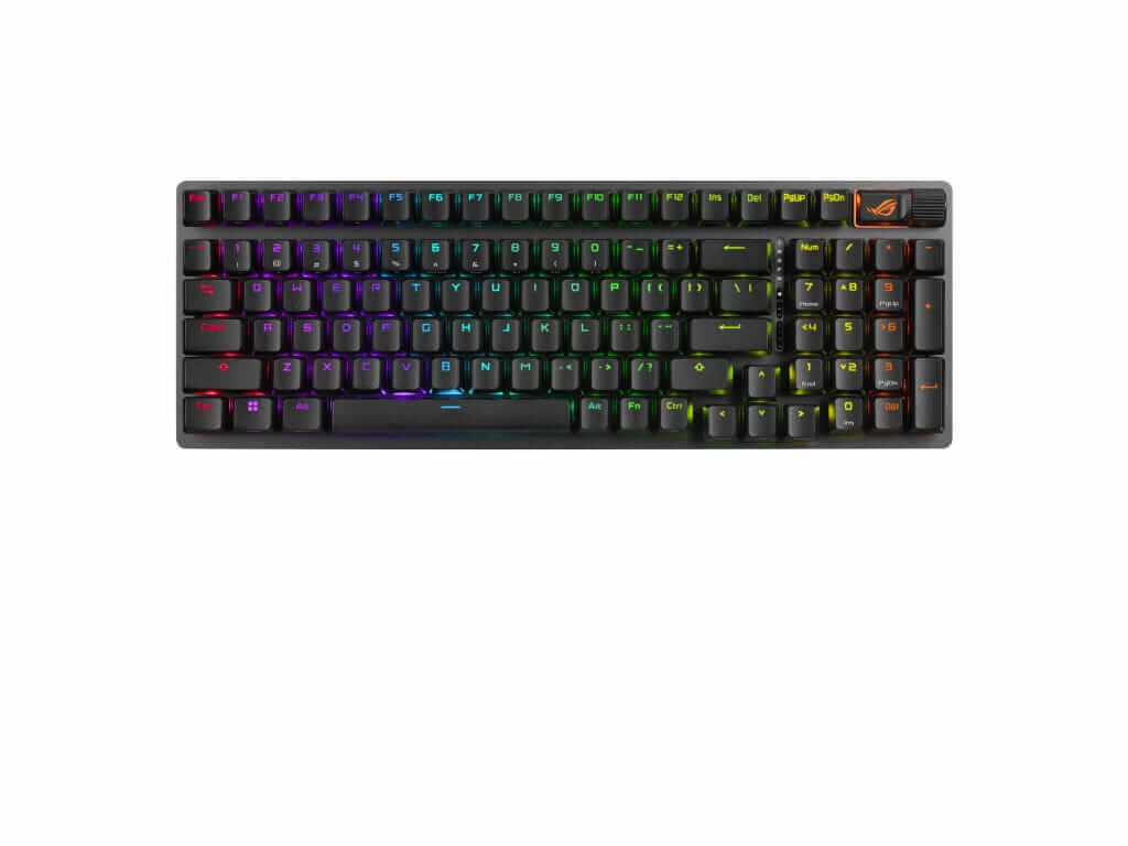 Kompaktna 96% igralna tipkovnica z vsemi funkcijskimi tipkami in številčnico, ki zavzame samo 1cm več prostora na mizi kot običajna 80% igralna tipkovnica. Ima dvoslojne PBT tipke, multimedijske tipke, zamenljiva ROG NX Snow stikala, naslon za zapestja in RGB individualno osvetljene tipke. Omogoča povezavo z Bluetooth, USB kablom in z USB Omni 2,4GHz sprejemnikom. Priložen USB-A v USB-C kabel dolžine 2m.