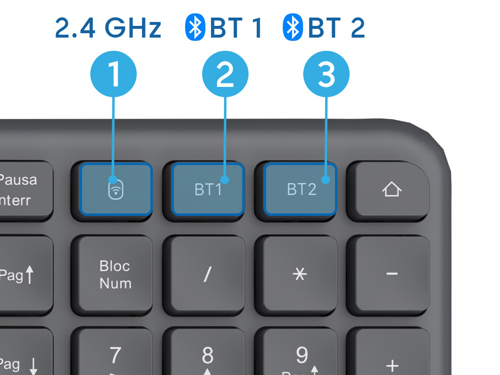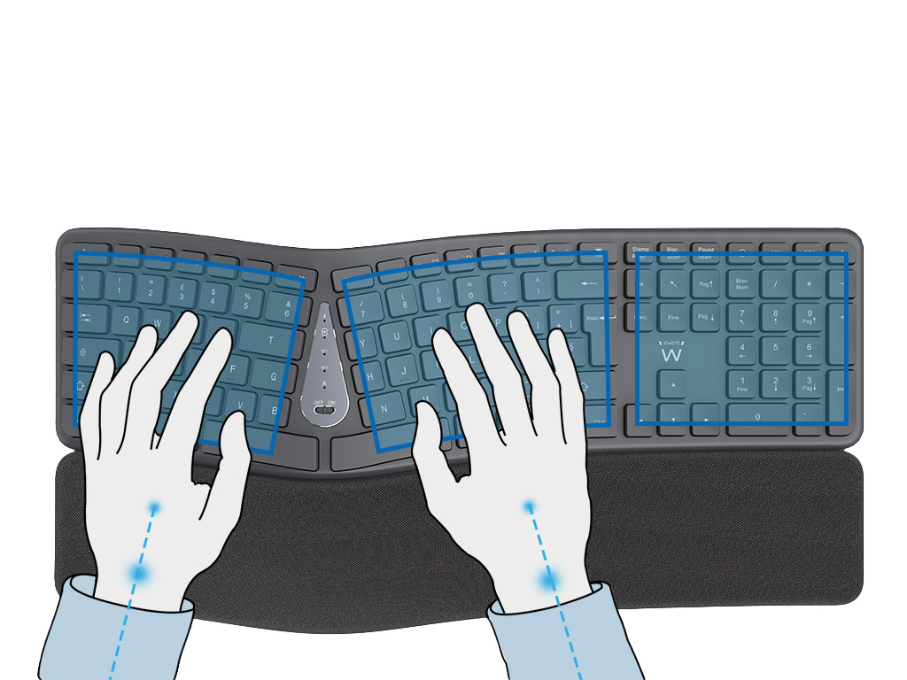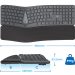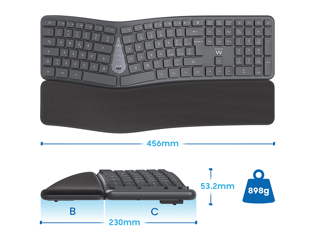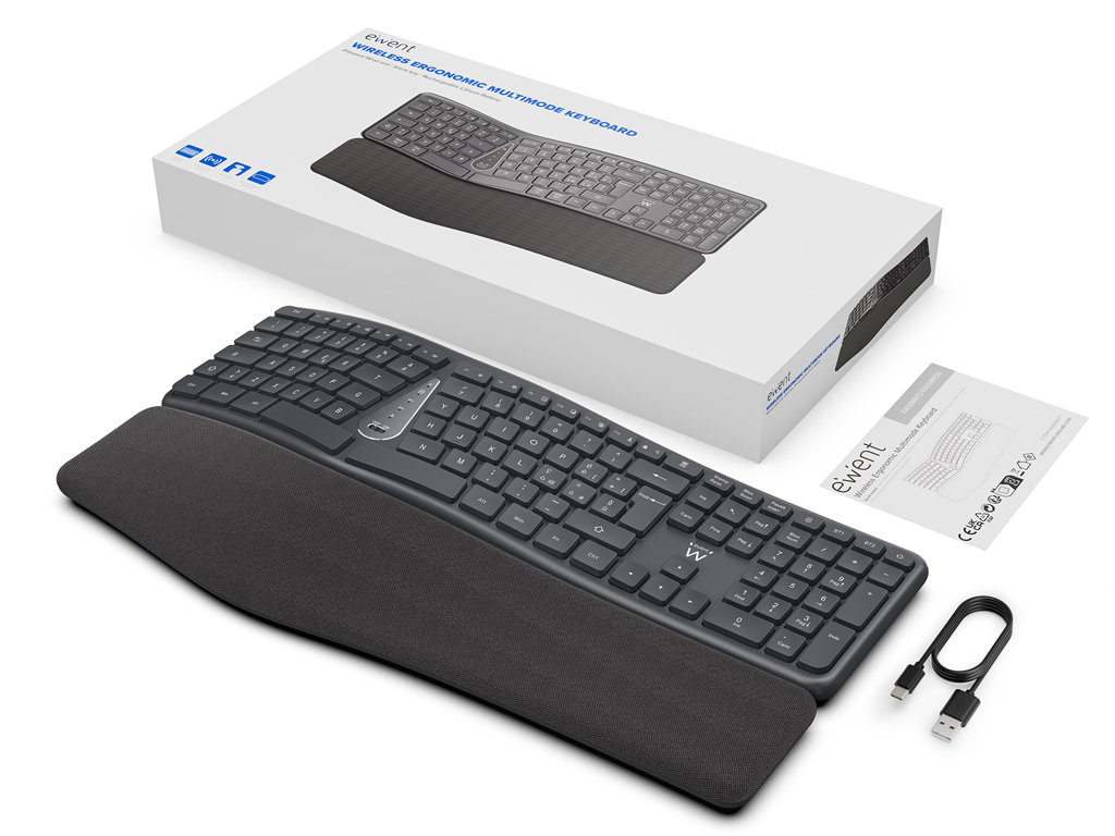 Ergonomska urkivljena brezžična tipkovnica s podloženim naslonom za zapestja ter mehkimi in tihimi tipkami za udobno tipkanje. Omogoča povezavo z 2,4GHz USB sprejemnikom in dvema Bluetooth napravama. Ima vgrajeno 300 mAh polnilno baterijo, ki se polni s priloženim USB-C kablom, prilagodljive nogice in 12 multimedijskih tipk.