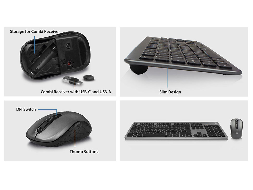 Ewent EW3262 je komplet brezžične tipkovnice in miške, ki se povežeta prek enega USB sprejemnika. Sprejemnik ima tako USB-A kot tudi USB-C konektor, priključite pa ga lahko na računalnik ali telefon. Tipkovnica se ponaša z nizkoprofilnimi tipkami s škarjastim mehanizmom za udobno tipkanje in 13 bližnjičnimi tipkami. Miška pa ponuja natančen optični senzor, stranske gumbe in DPI stikalo. Obe napravi imata stikalo za vklop/izklop in pameten sistem varčevanja z baterijo.