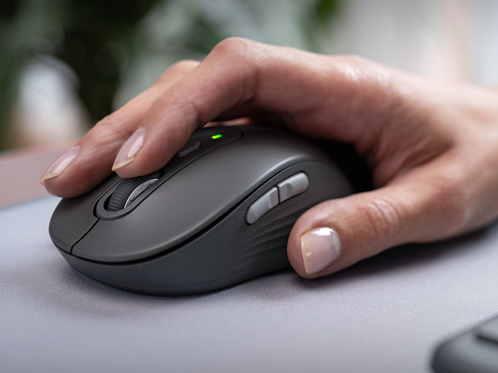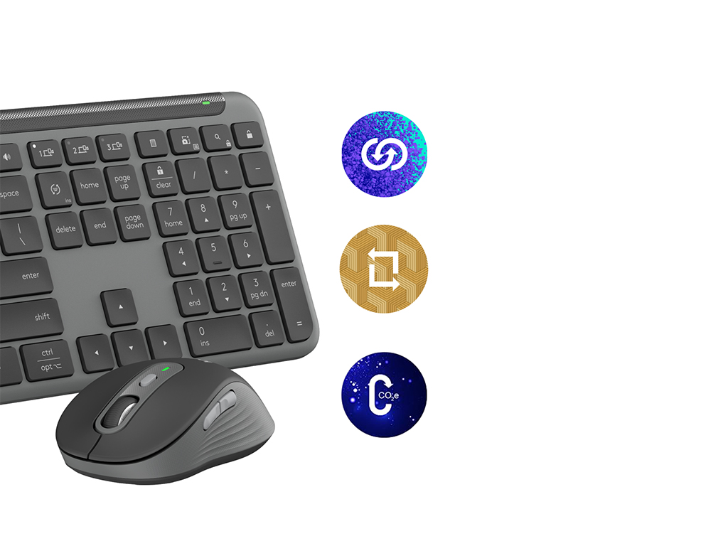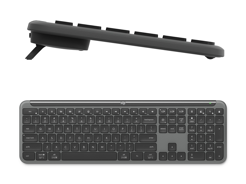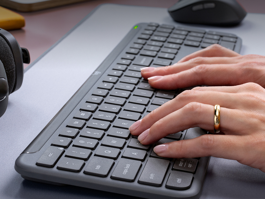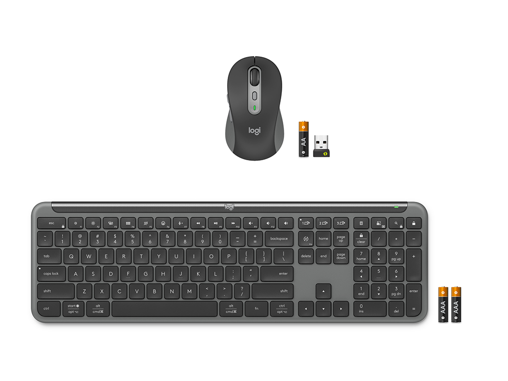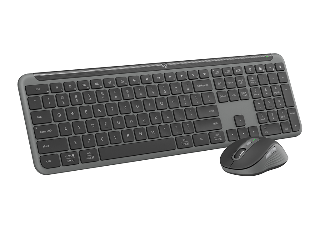 Komplet miške in tipkovnice Signature Slim MK950 omogoča enostavno brezžično povezavo z Logi Bolt sprejemnikom ali Bluetooth-om in enostavno preklaplanje med povezanimi napravami z Easy-Switch gumbi. Miška ima optični senzor s 1000 DPI, tihi klik in kolešček s SmartWheel tehnologijo, tipkovnica pa ima tihe tipke, nastavljive ergonomske nogice ter indikatorske lučke za baterijo, velike črke in povezavo. Priložene 2x AAA in 1x AA baterije za tipkovnico in miško.