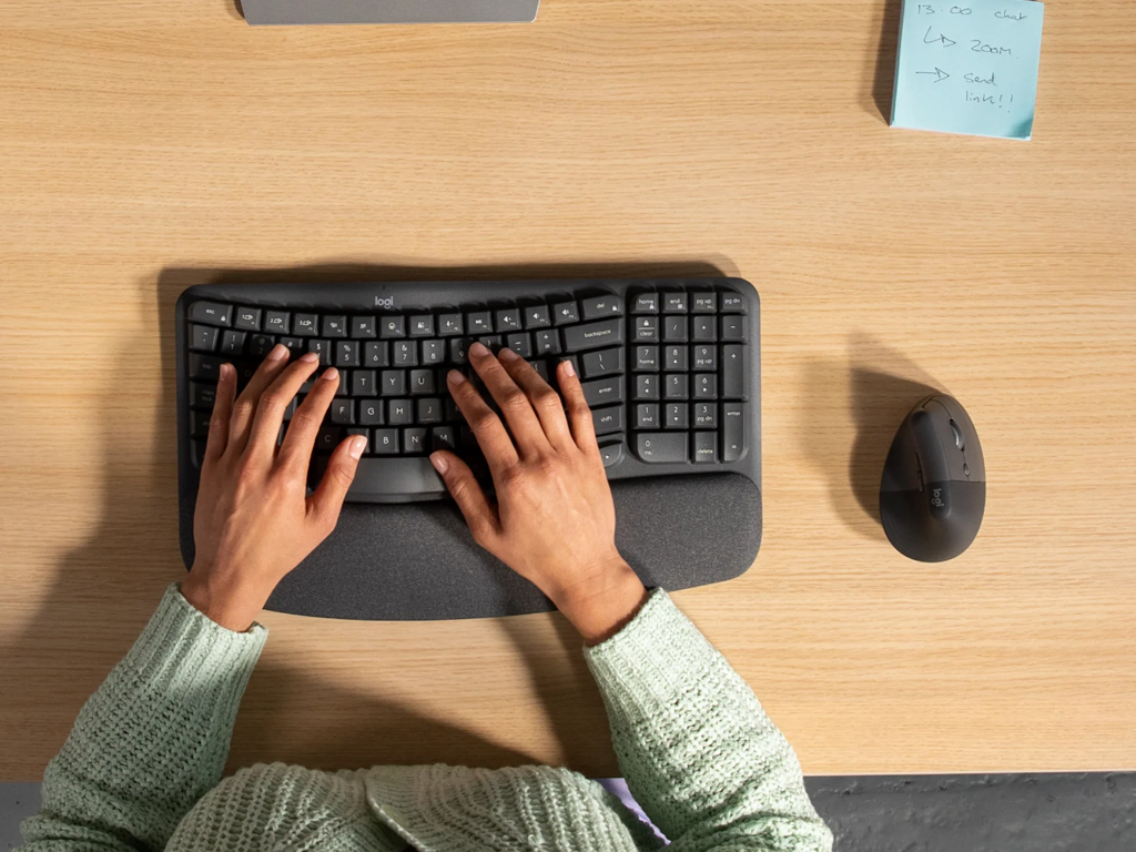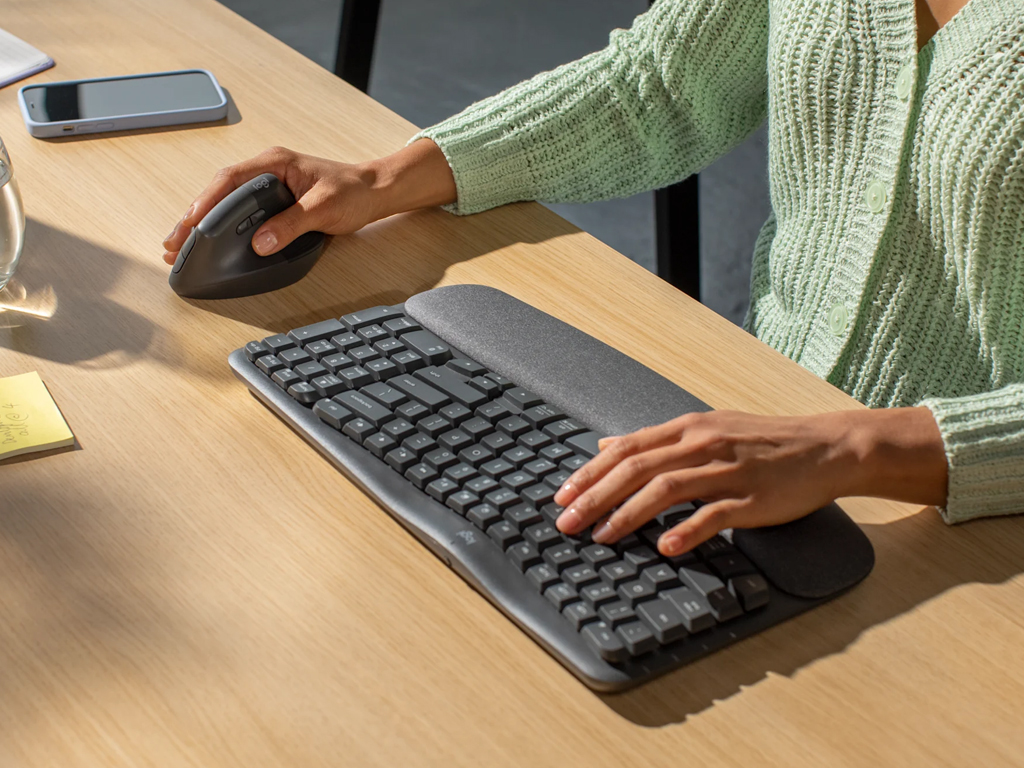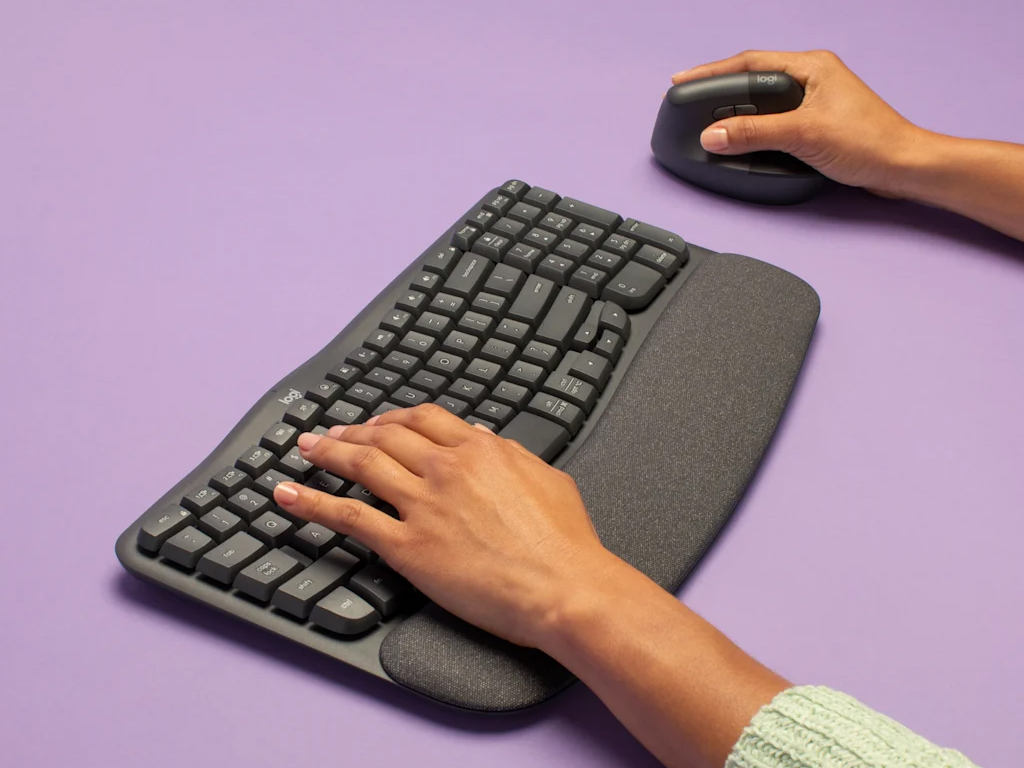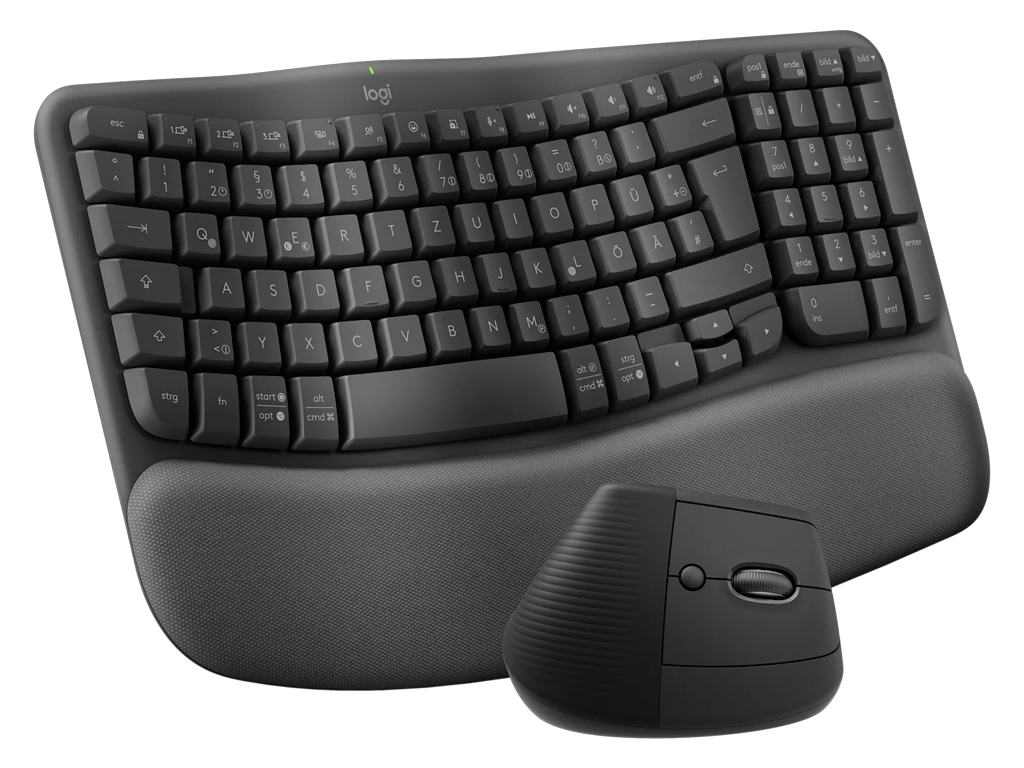 Komplet Logitech Wave Keys ergonomske tipkovnice in Lift vertikalne miškeKomplet omogoča bolj naravno držo med uporabo računalnika in enostavno preklaplanje med 3 povezanimi napravami, ki je mogoča s priloženim Logi Bolt USB sprejemnikom ali z Bluetooth povezavo. Tipkovnica ima nastavljive nogice, ki spremenijo naklon tipkovnice za +4°. Za napajanje kompleta skrbijo priloženi 2x AAA bateriji v tipkovnici in 1x AA baterija v miški.