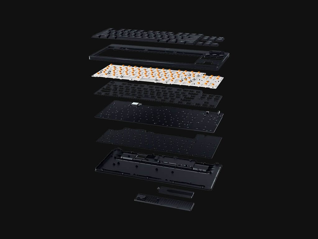 Računalniška opremaTipkovnice za računalnikNizkoprofilna brezžična mehanska tipkovnica z rumenimi (tihimi) mehanskimi stikali, zgornjo ploščo iz aluminija, dvoslojnimi PBT tipkami in optimizirano akustiko pri tipkanju v TKL formatu. Omogoča brezžično povezavo z USB sprejemnikom ali Bluetoothom, ter povezavo s kablom. Ima večfunkcijski kolešček in 3 dodatni nadzorni gumbi. Baterija omogoča do 980 ur uporabe. Opremljena z Razer Chroma RGB osvetlitvijo.