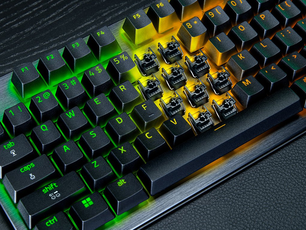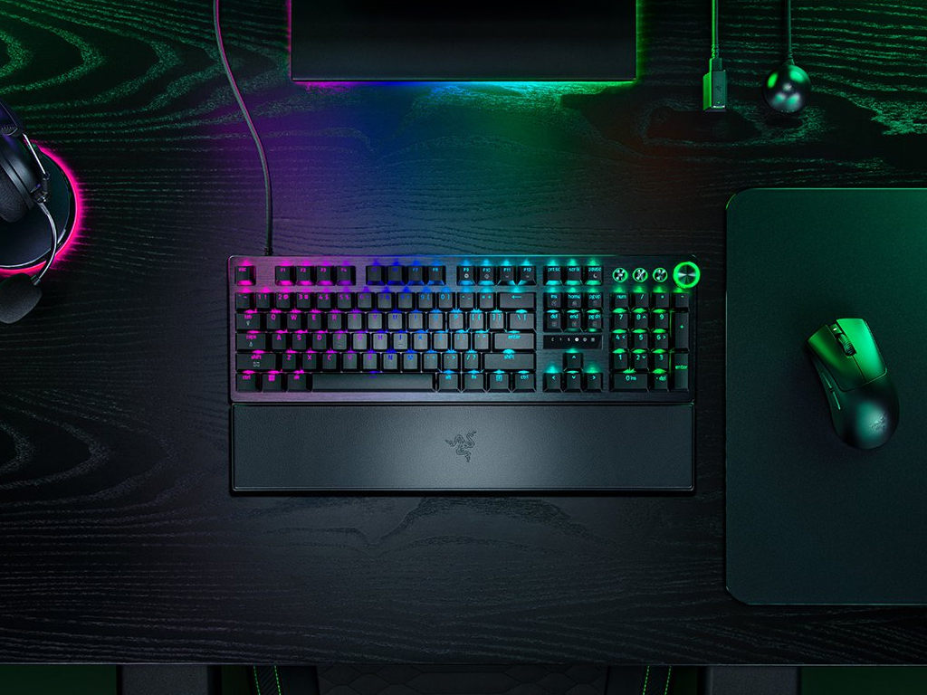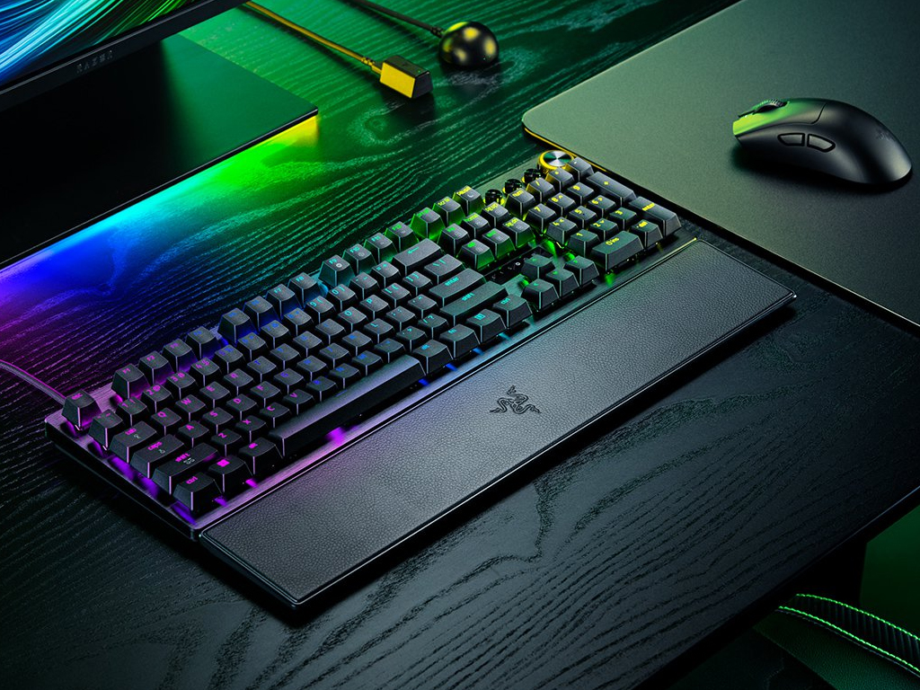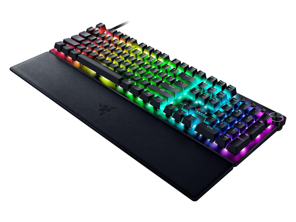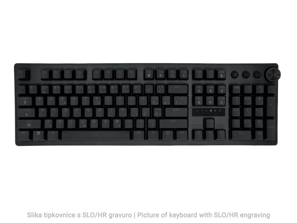 Računalniška opremaTipkovnice za računalnikIgralna tipkovnica z individualno osvetljenimi dvoslojnimi PBT tipkami in 8000Hz frekvenco poročanja (polling rate). Vsebuje analogna Razer stikala 2. generacije, ki omogočajo hitro prilagoditev proženja od 0,1 do 4 mm. Ima tudi multifunkcijski vrtljivi gumb in medijske tipke. Zgornja plošča iz aluminija poskrbi za togost in robustnost, magnetni naslon za zapestja pa za udobje. Priklop z odstranljivim USB-C kablom.