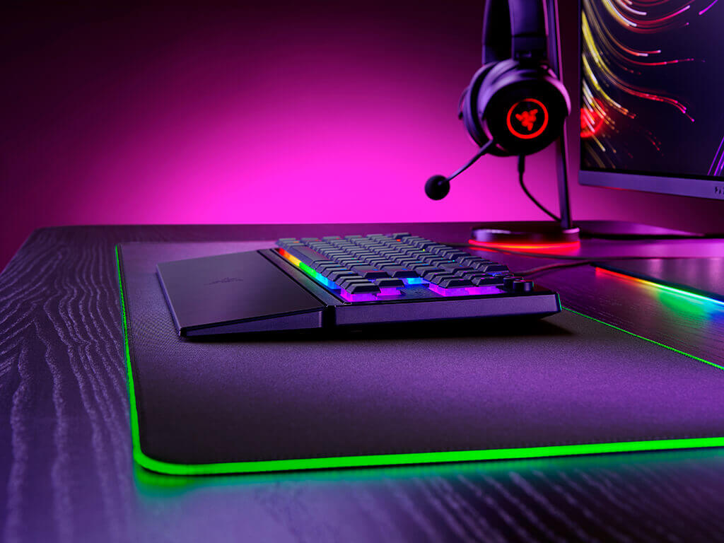 Računalniška opremaTipkovnice za računalnikIgralna tipkovnica manjšega formata in nižjega profila z Mecha-membranskimi stikali. Opremljena je z 8 consko RGB Razer Chroma osvetlitvijo, ki omogoča 16,8 milijonov barv in kopico svetlobnih efektov. Za bolj udobno uporabo vsebuje priložen magnetni naslon za zapestja. Tipkovnica se priljuči na računalnik s pletenim USB kablom, ima 1000Hz frekvernco poročanja in omogoča pritisk 6 tipk hkrati.