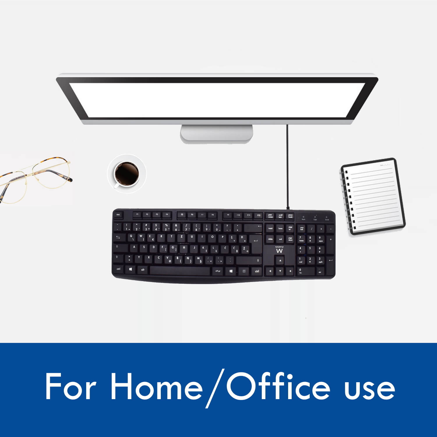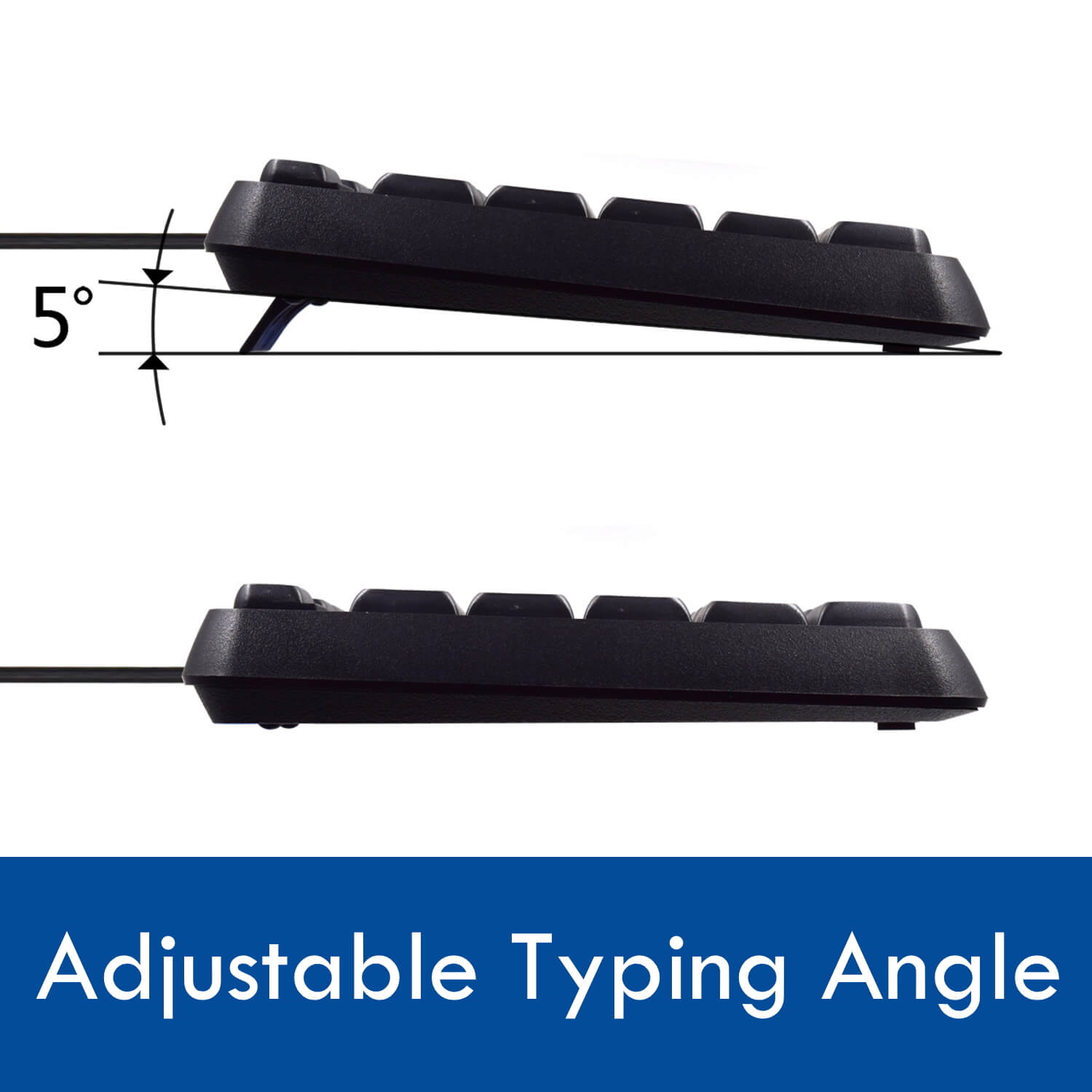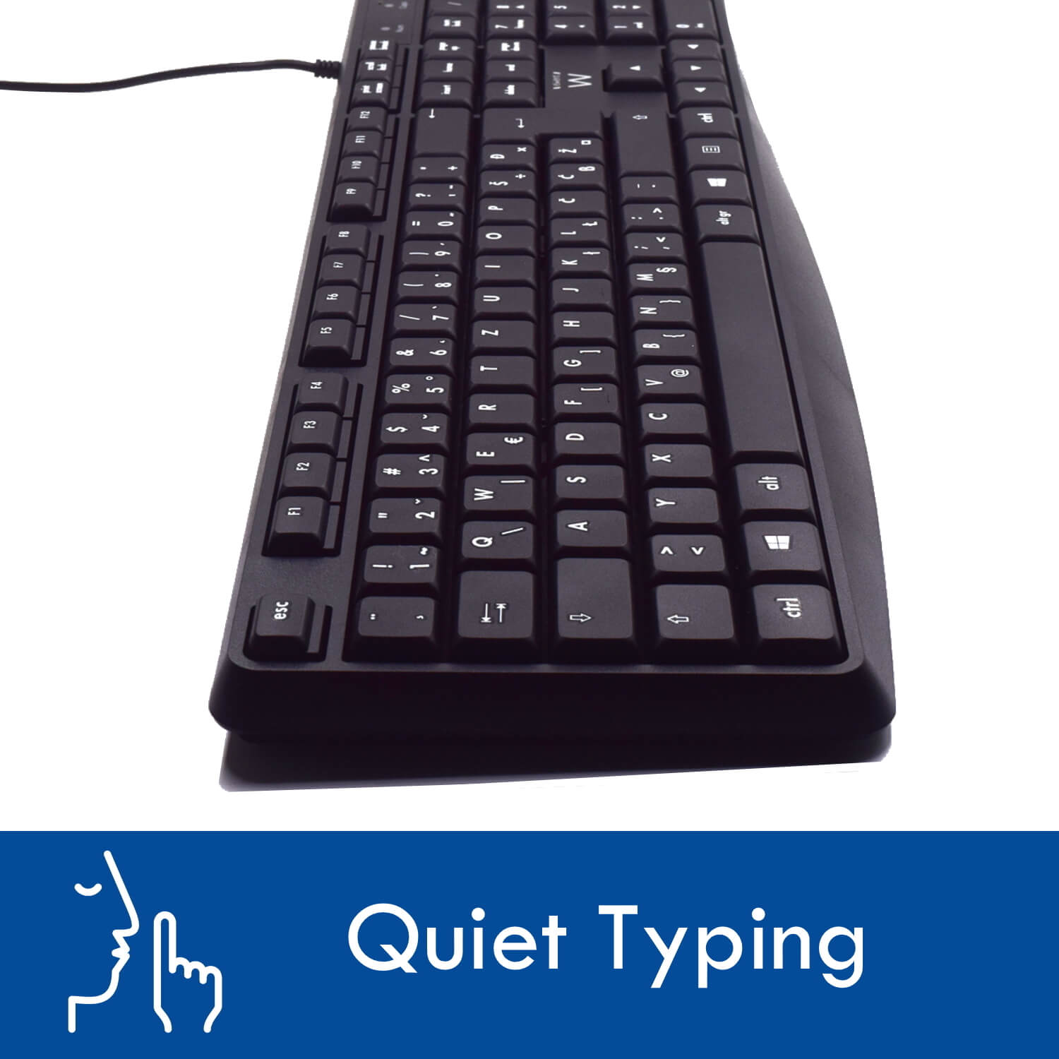 Žična tipkovnica opremljena s tihimi tipkami in slovensko postavitvijo. Tipkovnica ima statusne LED lučke za Caps Lock, Num Lock in Scroll Lock. Priklop z USB kablom dolžine 1,35 m.