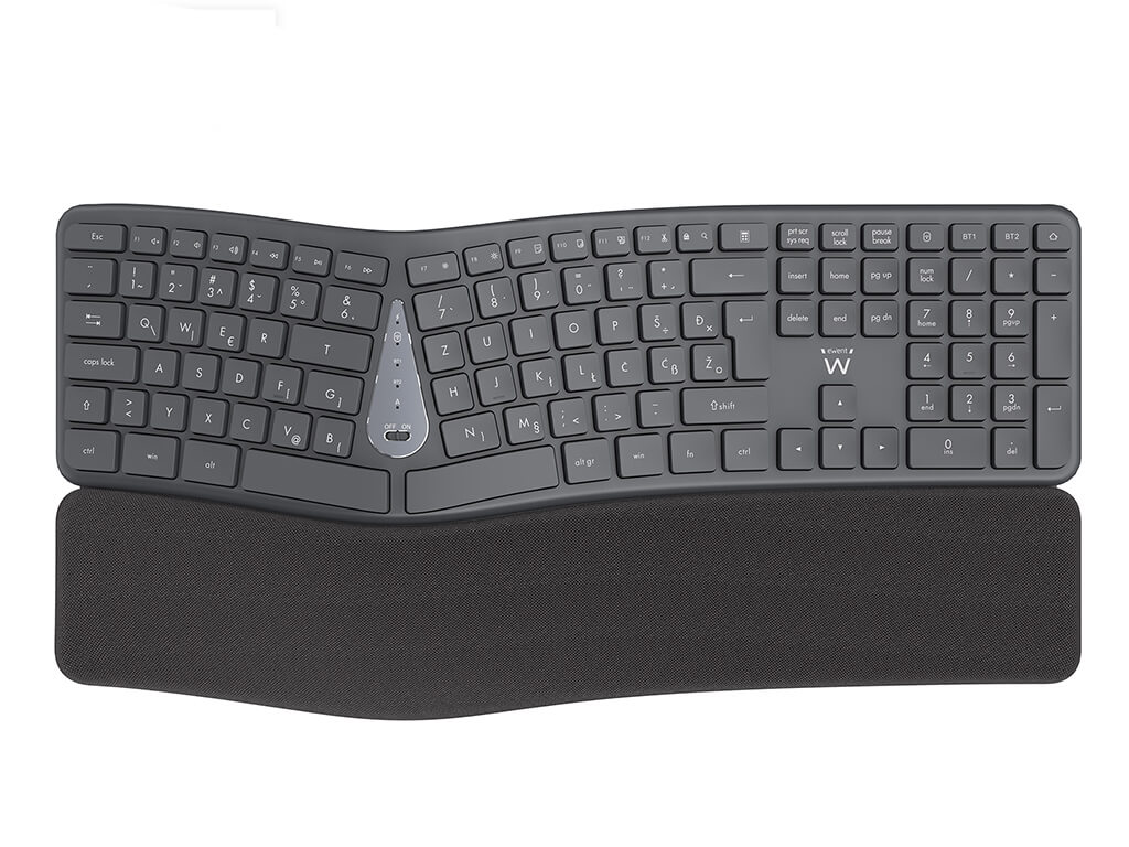 Ergonomska urkivljena brezžična tipkovnica s podloženim naslonom za zapestja ter mehkimi in tihimi tipkami za udobno tipkanje. Omogoča povezavo z 2,4GHz USB sprejemnikom in dvema Bluetooth napravama. Ima vgrajeno 300 mAh polnilno baterijo, ki se polni s priloženim USB-C kablom, prilagodljive nogice in 12 multimedijskih tipk.