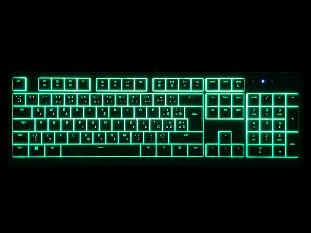 Računalniška opremaSlovenska TipkovnicaTipkovnice za računalnikIgralna tipkovnica nižjega profila z mehkimi mebranskimi stikali. Opremljena z RGB Razer Chroma osvetlitvijo, ki omogoča 16,8 milijonov barv in kopico svetlobnih efektov. Za bolj udobno uporabo vsebuje priložen magnetni naslon za zapestja. Tipkovnica se priljuči na računalnik s pletenim USB kablom, ima 1000Hz frekvernco poročanja in omogoča pritisk 6 tipk hkrati.