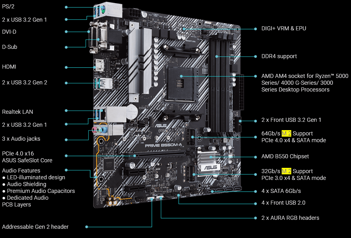 Serija ASUS Prime je strokovno zasnovana za sprostitev celotnega potenciala platforme AMD Ryzen 3. generacije. Matične plošče serije Prime B550, se ponašajo z robustno napajalno zasnovo, obsežnimi rešitvami za hlajenje in inteligentnimi možnostmi prilagajanja. Vsakodnevnim uporabnikom in izdelovalcem osebnih računalnikov DIY zagotavljajo vrsto možnosti prilagajanja zmogljivosti prek intuitivne programske in vdelane programske opreme.