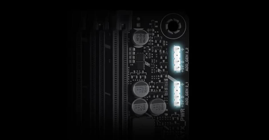 - Razsvetljava Aura Sync RGB: Vgrajeni naslovni vodniki Gen 2 in vodnik Aura RGB za trakove RGB LED, enostavno sinhronizirane s strojno opremo, ki podpira Aura Sync