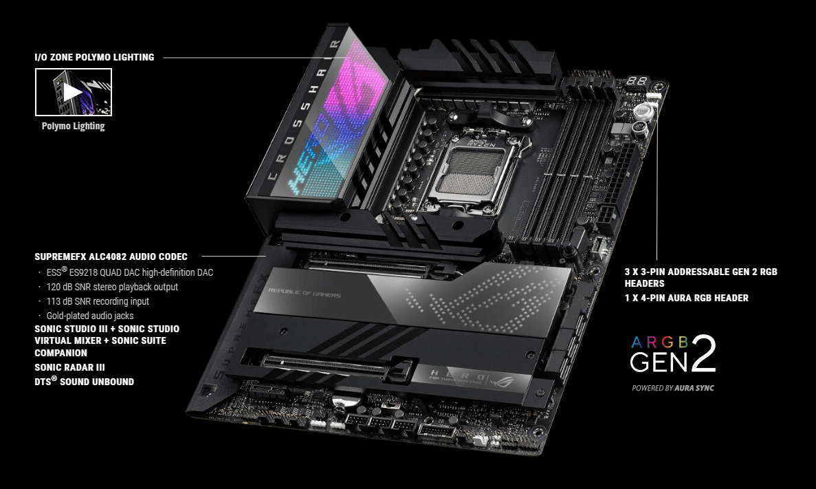Dvojni chipset dizajn plošče ROG Crosshair X670E Hero prinaša bogato pasovno širino za priključene naprave za neomejene možnosti. WiFi 6E, dvojna USB4 mesta v zadnjem I/O so dodana skupaj z zadostno količino dodatnih vrat za vse vaše naprave. Matična plošča je opremljena s SupremeFX audiom, ki prinaša premium, izjemen zvok z uporabo izboljšan ESS quad-DAC ojačevalec. Po drugi strani pa ima 5 PCIe 5.0 M.2 gonilnikov, ki jih lahko naložimo za neverjetno hitrost nalaganja in prenašanja.
