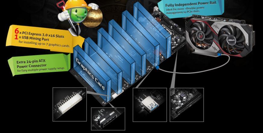 Ta osnovna plošča je posebej zasnovana za mining, revolucionarno digitalno valuto, ki se lahko uporablja kjer koli po svetu. 6 PCIe rež zagotavlja hitro rudarjenje, dodatni priključki za napajanje pa zagotavljajo napredno stabilnost sistema med delovanjem.