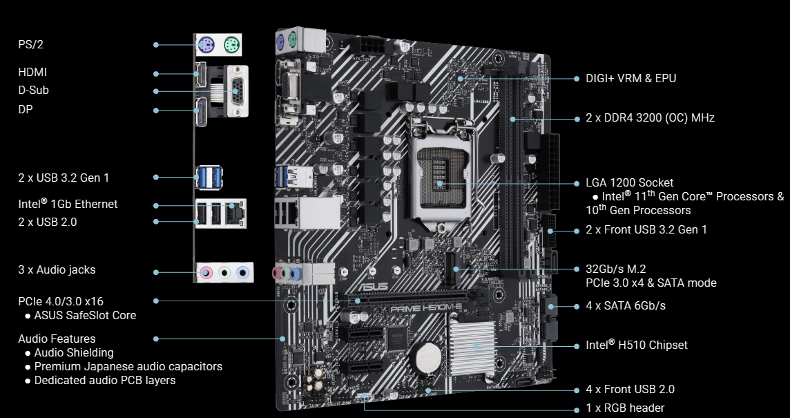 Serija Prime H510 je zasnovana za obdelavo dodatnih jeder in večje pasovne širine procesorjev Intel Core 11. generacije. Matične plošče ASUS H510 nudijo vse osnove za povečanje dnevne produktivnosti, zato bo vaš sistem pripravljen na delovanje s stabilno močjo, intuitivnim hlajenjem in prilagodljivimi možnostmi prenosa.