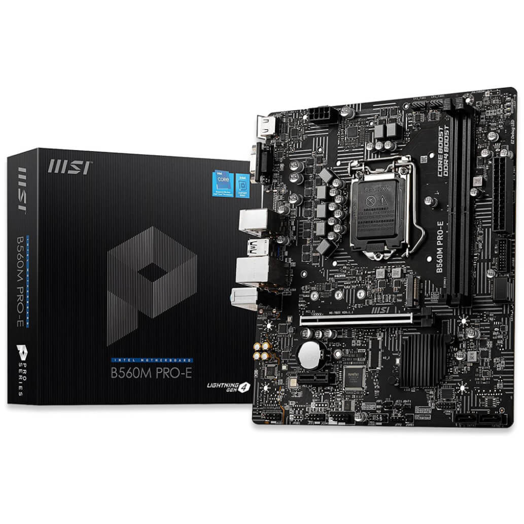 MSI B560M PRO-E. Proizvajalec procesorja: Intel, Vtičnica za procesor: LGA 1200, Združljivi procesorji: Intel Celeron, Intel Core i5, Intel Core i7, Intel Core i9, Intel Pentium. Podprt pomnilnik: DDR4-SDRAM, največji pomnilnik RAM: 64 GB, vrsta pomnilnika: DIMM. Podprti vmesniki shranjevalnih pogonov: M.2, SATA, Podprti pogoni za shranjevanje: HDD & SSD disk. Največja ločljivost: 4096 x 2304 slikovnih pik. Različica HDMI: 2.0b, USB priključek: USB Type-A