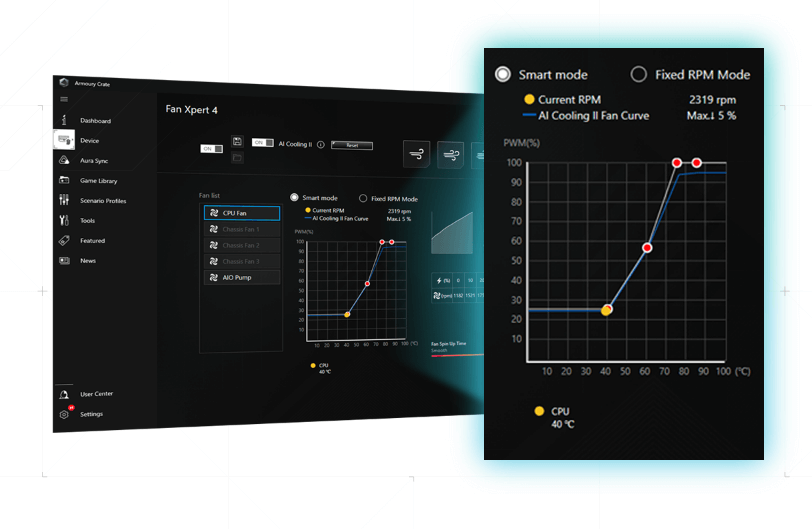 ASUS Intelligent Control naredi vaš računalnik pameten. Poleg tega, da skrbi za zapleteno nastavitev in dinamično optimizacijo bistvenih vidikov vašega sistema, ponuja inteligentno poenostavljene možnosti za novince v DIY računalniku, kot tudi obsežnejše funkcije za izkušene veterane.