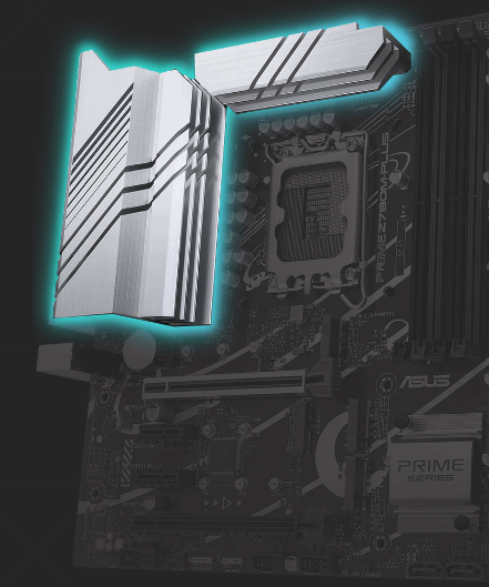 Masivna hladilnika pokrivata VRM in “chokes” za izboljšanje odvajanja toplote. Skupaj s posebej zasnovanimi toplotnimi blazinicami izboljšajo prenos toplote iz MOSFET-jev in “chokes” za boljše hlajenje.