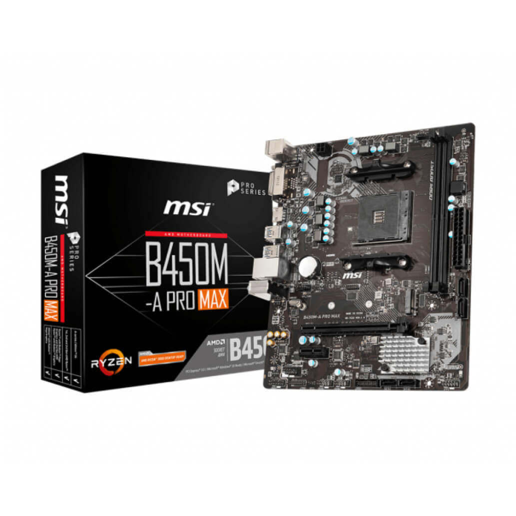 MSI B450M-A PRO MAX. Proizvajalec procesorja: AMD, Podnožje za procesor: Socket AM4, Združljivi procesorji: AMD Athlon, AMD Ryzen, AMD Ryzen 3, 2nd Generation AMD Ryzen 3, AMD Ryzen 3 3rd Gen, AMD Ryzen…. Podprti pomnilnik: DDR4-SDRAM, RAM – Največji pomnilnik: 32 GB, Vrsta pomnilnika: DIMM. Podprti vmesniki za pomnilniške pogone: SATA III, Podprti pogoni za shranjevanje: HDD & SSD disk. Največji pomnilnik grafične kartice: 2048 MB, Največja ločljivost: 4096 x 2160 slikovnih pik. Priključek USB: USB Type-A