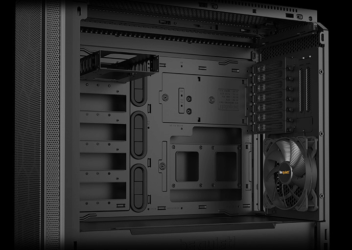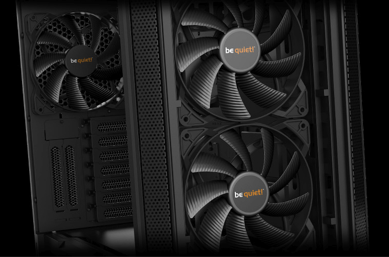 Trije prednameščeni ventilatorji Pure Wings 2 140 mm z lopaticami ventilatorjev, optimiziranimi za pretok zraka, zagotavljajo popoln pretok zraka in trdno hlajenje, ne glede na to, ali ste izbrali konfiguracijo, optimizirano za visok pretok zraka ali tišino.
