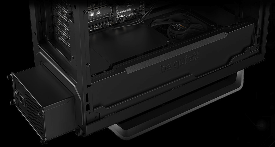 PSU popolnoma pokriva kable, PSU in vsebuje dvojno ohišje HDD. Pokrovne plošče so ločeno snemljive, da namestite 140 mm ventilator na vrh. Z majhnim ločenim pokrovom lahko spredaj namestite 360mm ali 420mm radiator. Z nosilcem PSU lahko napajalno enoto enostavno namestite od zadaj.