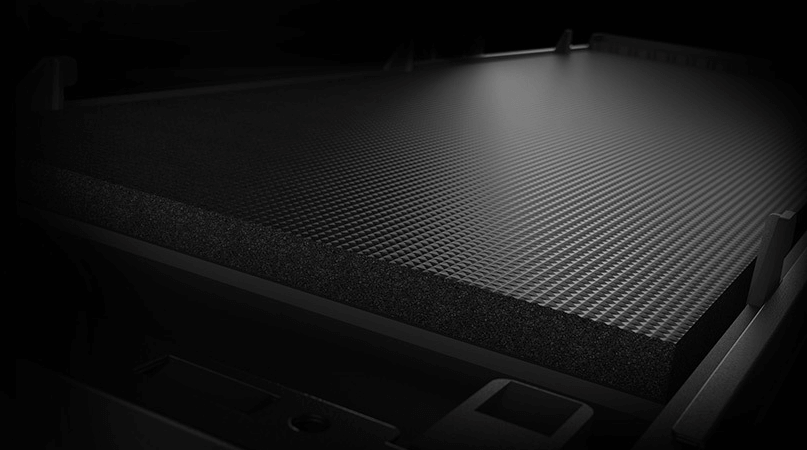Sprednji in bočni deli so opremljeni z izjemno debelimi blažilnimi blazinami do 10 mm, kar zagotavlja največjo stabilnost in izjemne zmožnosti dušenja hrupa. Ločeni nosilec PSU, pladenj za matično ploščo in ohišja za trdi disk tudi zmanjšajo vibracije. Polno kovinsko ohišje zagotavlja stabilnost ohišja in izboljša njegovo haptičnost.